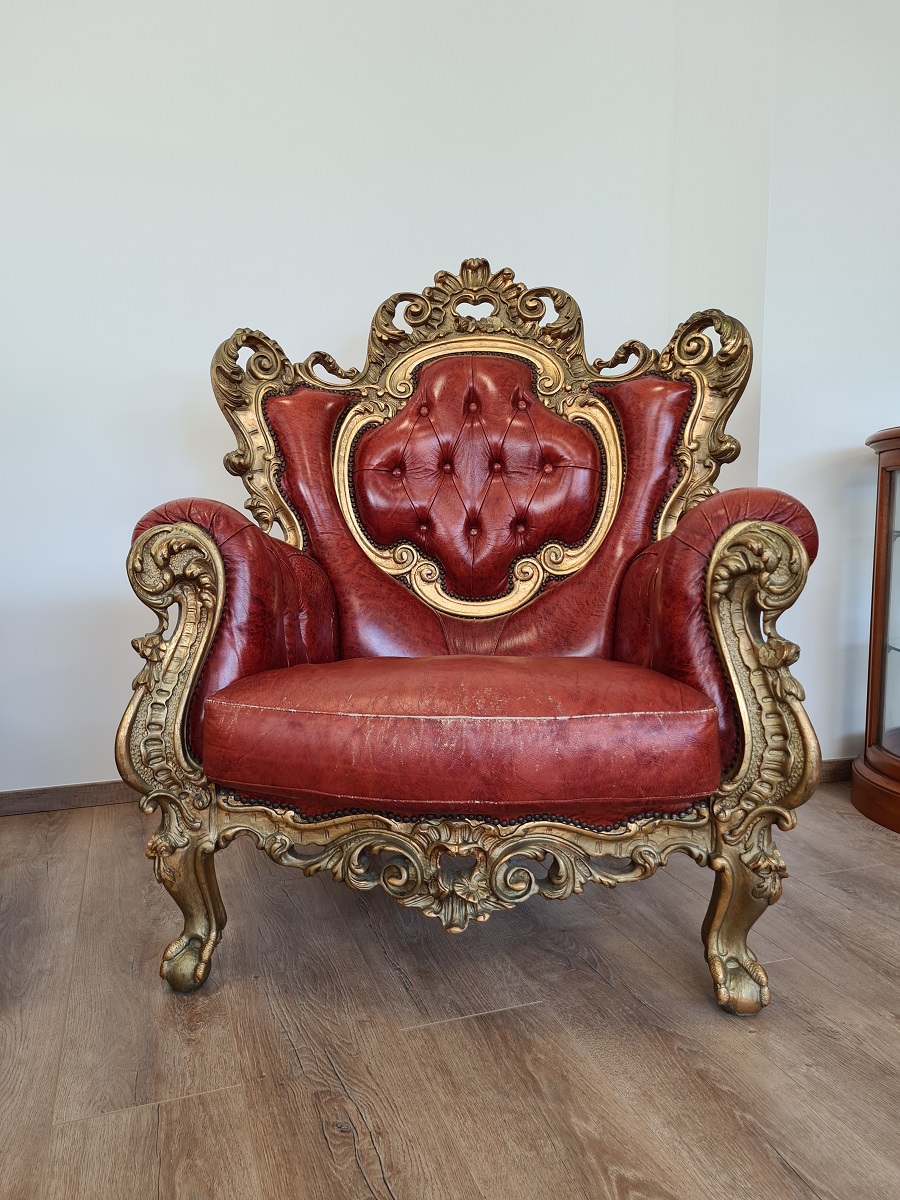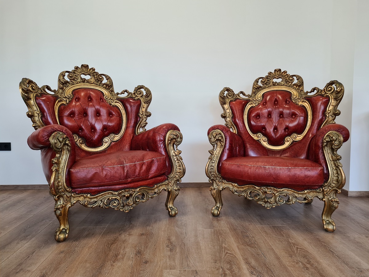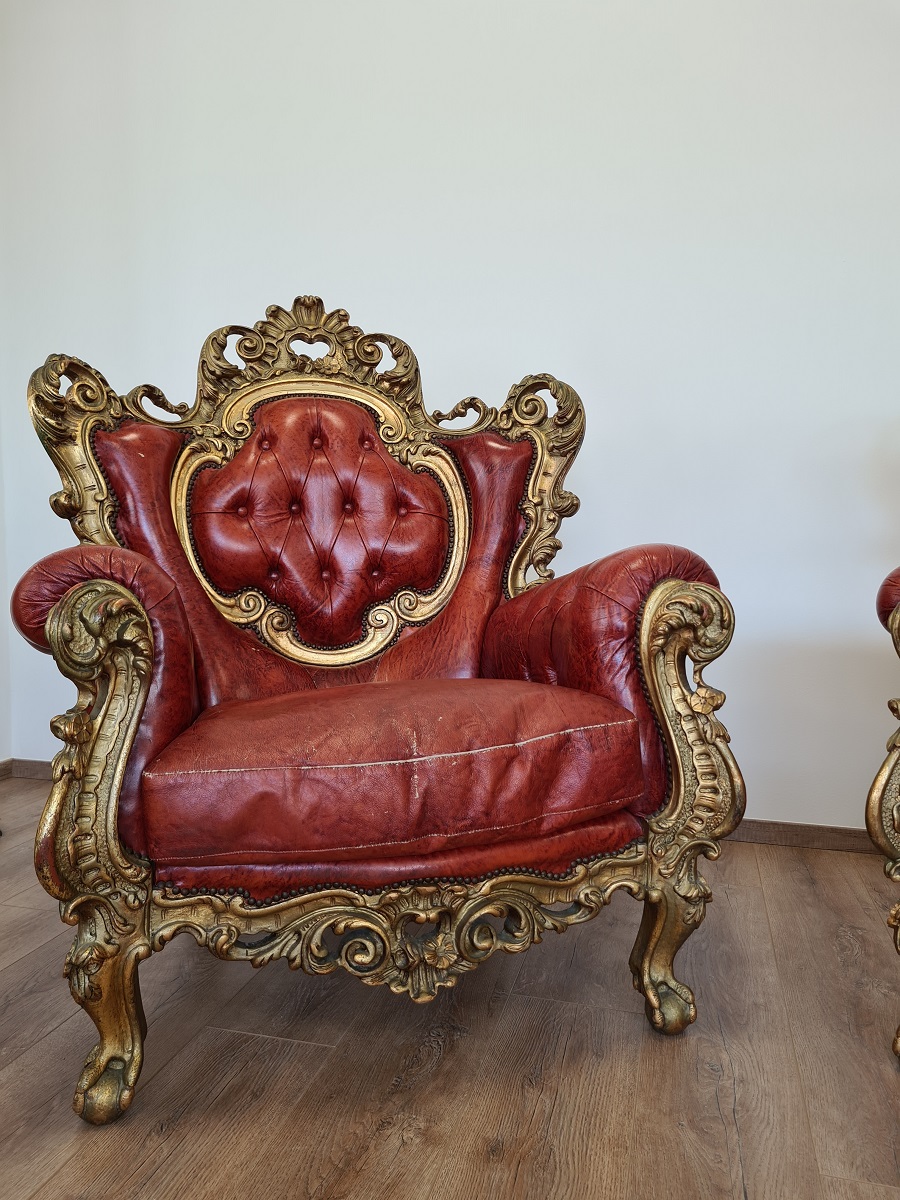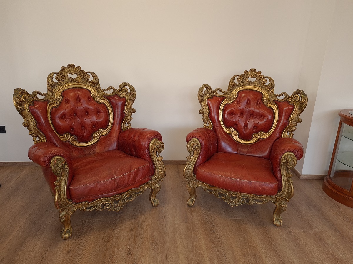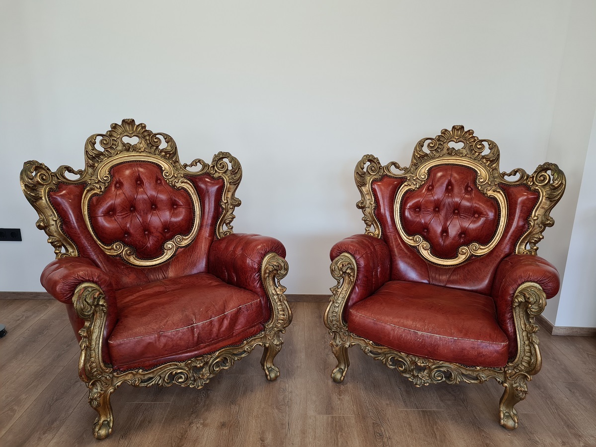 Dvije predivne, barokne, raskošne fotelje, rad sa zlatnim listićima, odlično stanje, masivne i