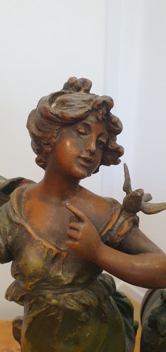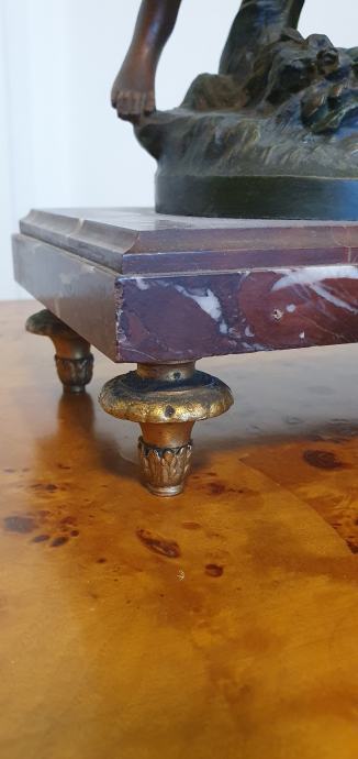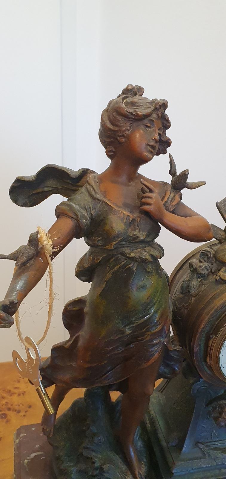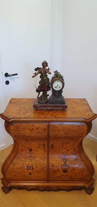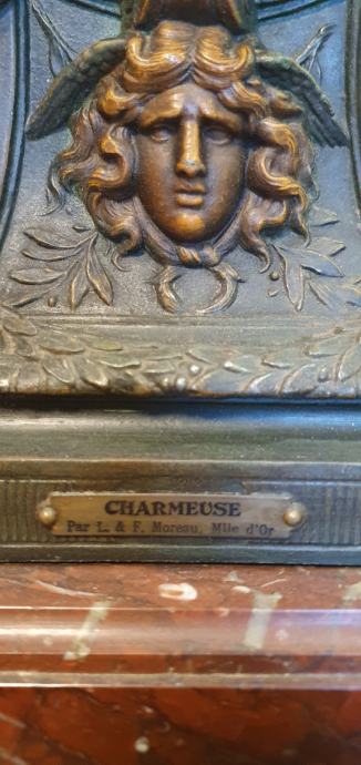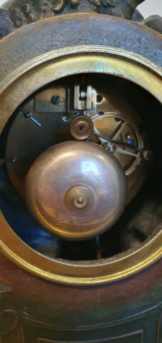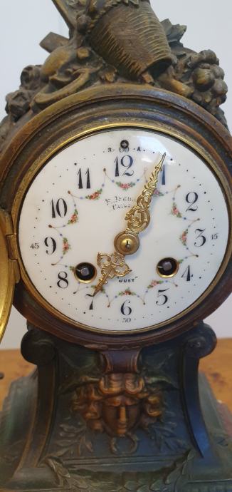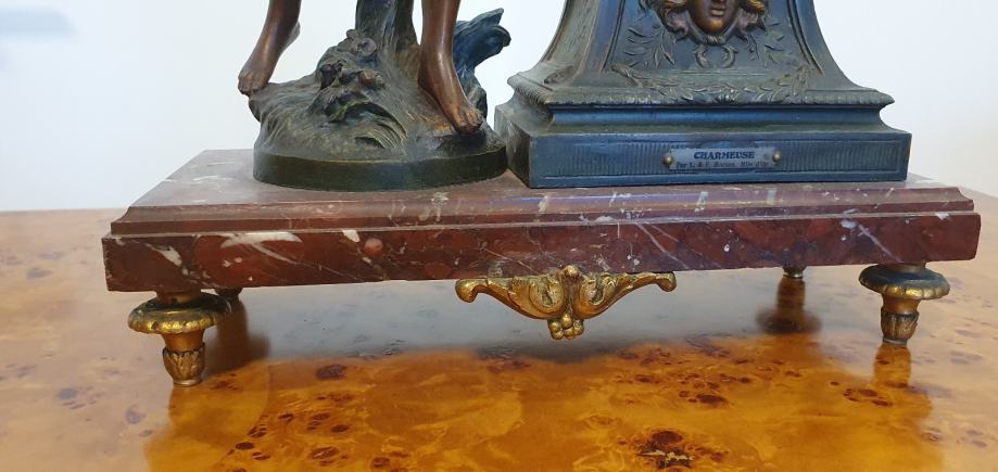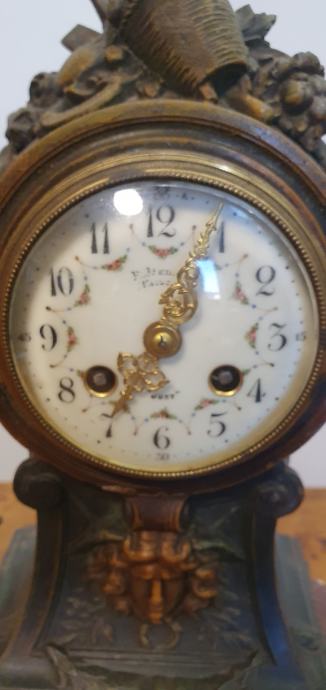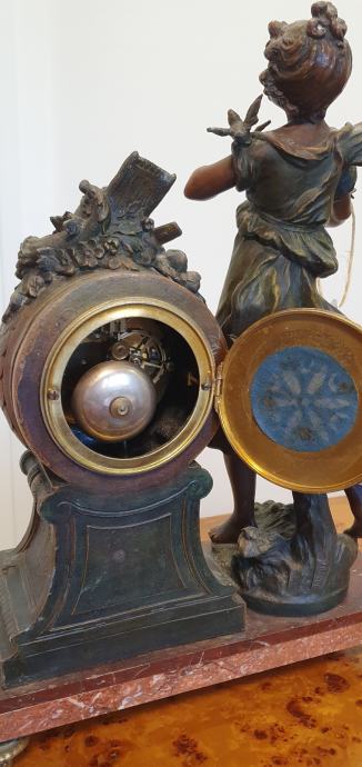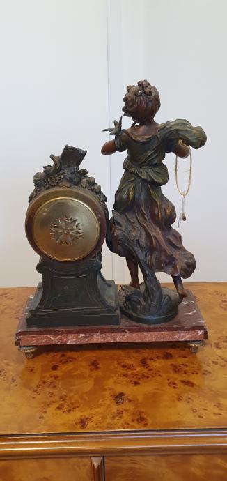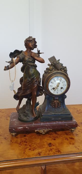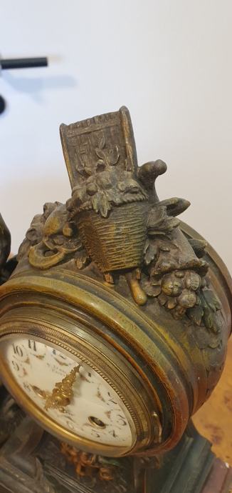 Francuski kaminski sat, na mramornom postolju. Dolazi s pripadajućim ključem. Sat je masivan i težak, ispravan.