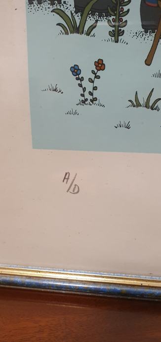 Grafika kod koje oznaka A/D označava autorsko djelo-autorski otisak. Pečat Hlebinske škole što ukazuje na autentičnost.