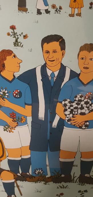 Na slici su prikazani igrači Dinama, te legendarni trener Ćiro Blažević u svom prepoznatljivom bijelom šalu, te navijači s plavim zastavama u pozadini.