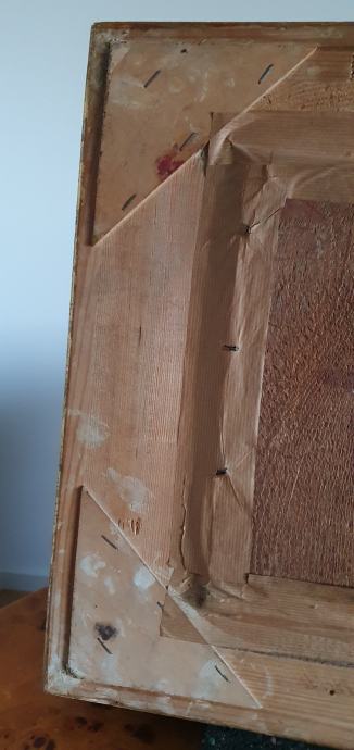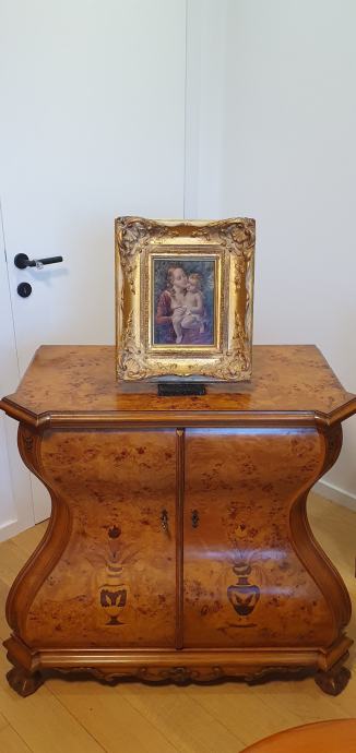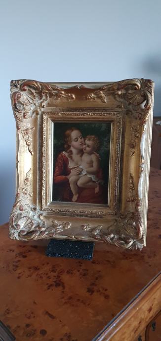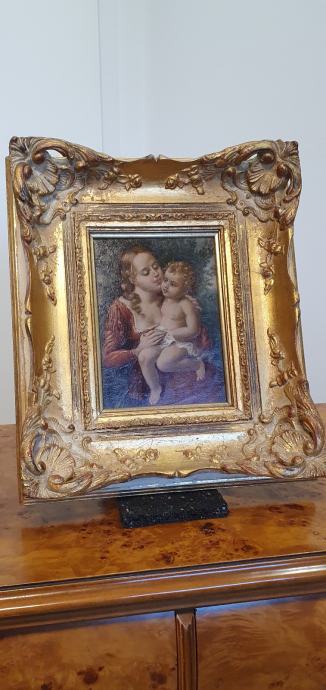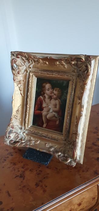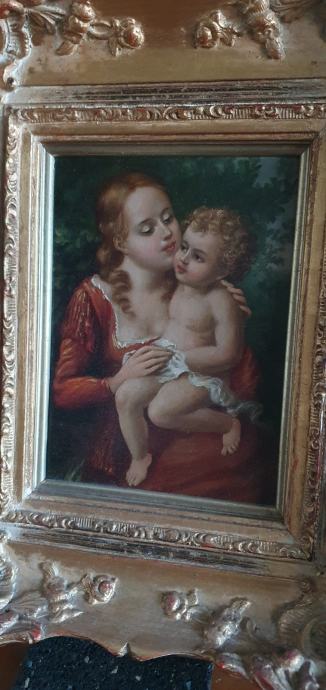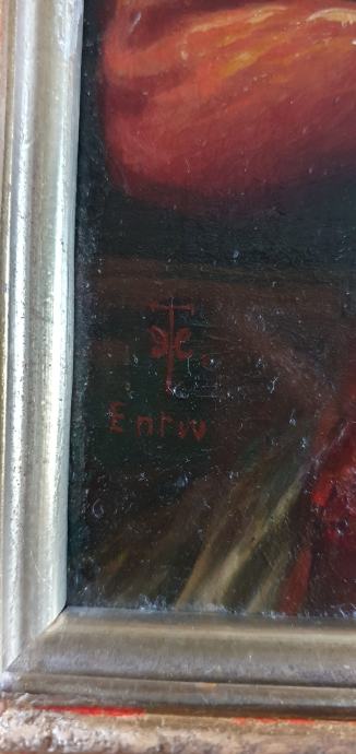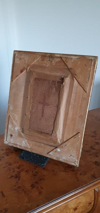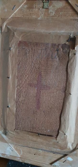 Stara vjerska slika, vrlo neobična, vrhunski rad, ulje na drvetu, neobičan potpis, masivan i bogat okvir, na pozadini pečat i adresa.