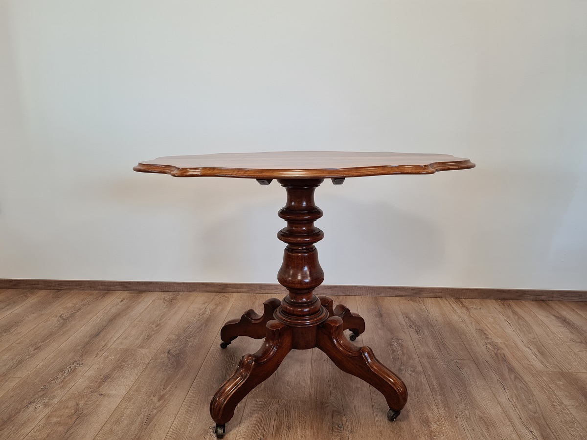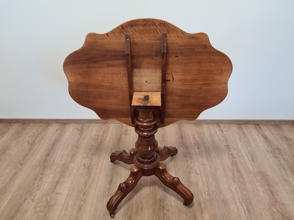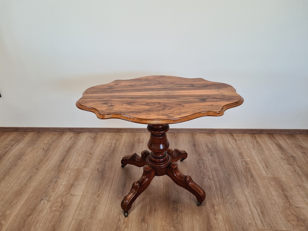 Stol manjih dimenzija, postolje od trešnje, radna ploha od korijena oraha. Vrhunski komad, rijetko. Dimenzije: ukupna visina 74 cm, dub 71 cm, š 99 cm